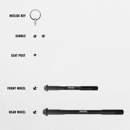 The anti-theft set blocks access to the bolts using a precision-engineered system of Hexlox Inserts and Hexlox Keys – thus preventing thieves from using conventional tools to open the bolts and steal your bike parts.